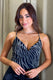 Blusa elaborada en tela suave y ligeramente elástica, decorado con un patrón ondulado en brillo que aporta un toque moderno y sofisticado. Presenta un escote drapeado profundo que realza la figura y tiras delgadas que se cruzan en la espalda, creando un look delicado y elegante.