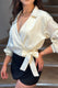 Detalle de lazo lateral ajustable que permite entallar la prenda a la cintura, aportando feminidad y sofisticación. Manga larga con puño elástico que brinda comodidad y un toque moderno. Cuello clásico que equilibra el diseño con un aire refinado.