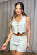 Conjunto Compuesto por chaleco sin mangas con botones frontales y short de tiro alto. Ambos tienen delicados bordados en relieve que aportan un toque elegante y fresco. Ideal para climas cálidos con estilo.