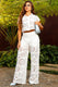Set de dos piezas en encaje con delicado estampado circular, compuesto por blusa tipo camisa corta y pantalón amplio de tiro alto.
