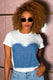 Camiseta blanca con diseño tipo corset en mezclilla azul, de estilo moderno y casual.