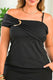 Blusa negra asimétrica diseñada con un hombro caído y un tirante delgado al otro lado, adornada con un elegante detalle metálico dorado que agrega un toque sofisticado.