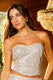 Blusa corta strapless totalmente decorada con lentejuelas, de brillo elegante y acabado estructurado que realza la figura y crea un look festivo y sofisticado.