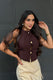 Blusa corta de tiras cruzadas en la espalda, con aberturas decorativas y lazos frontales con botones dorados que realzan su diseño elegante y femenino.