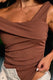 Esta blusa destaca por su diseño asimétrico y sofisticado, confeccionada en una tela de punto con textura corrugada premium que proporciona un ajuste elástico y entallado al cuerpo. Su silueta se define por un escote de hombro caído que cruza elegantemente el pecho, creando un efecto de drapeado natural que resalta la zona de la clavícula.