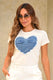 Camiseta de silueta clásica con detalle frontal en forma de corazón elaborado en mezclilla desflecada, que le da un aire juvenil y moderno.