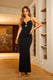 Vestido largo de tiras delgadas con escote profundo, detalle metálico frontal y aberturas estratégicas que realzan la silueta con elegancia.