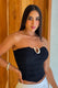 Blusa strapless con textura en franjas y un detalle frontal metálico dorado que aporta un toque moderno, llamativo y juvenil sin perder comodidad.