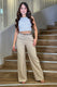 - Pierna ancha, bolsillos laterales y cinturón delgado