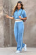 Conjunto en denim claro compuesto por camisa de manga corta y pantalón de bota ancha con pretina elástica en tono blanco y líneas laterales contrastantes.