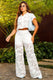 Set de dos piezas en encaje con delicado estampado circular, compuesto por blusa tipo camisa corta y pantalón amplio de tiro alto.